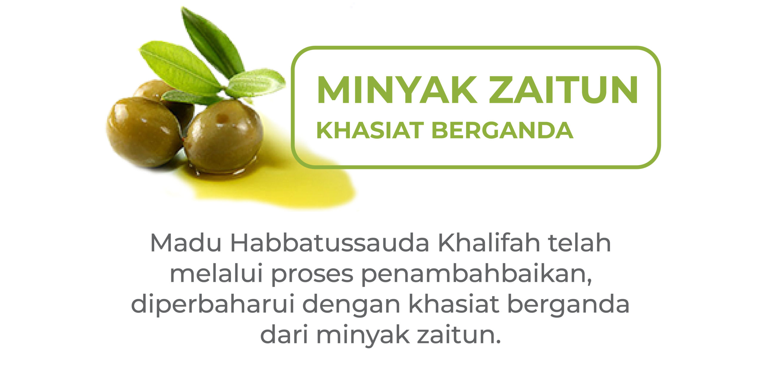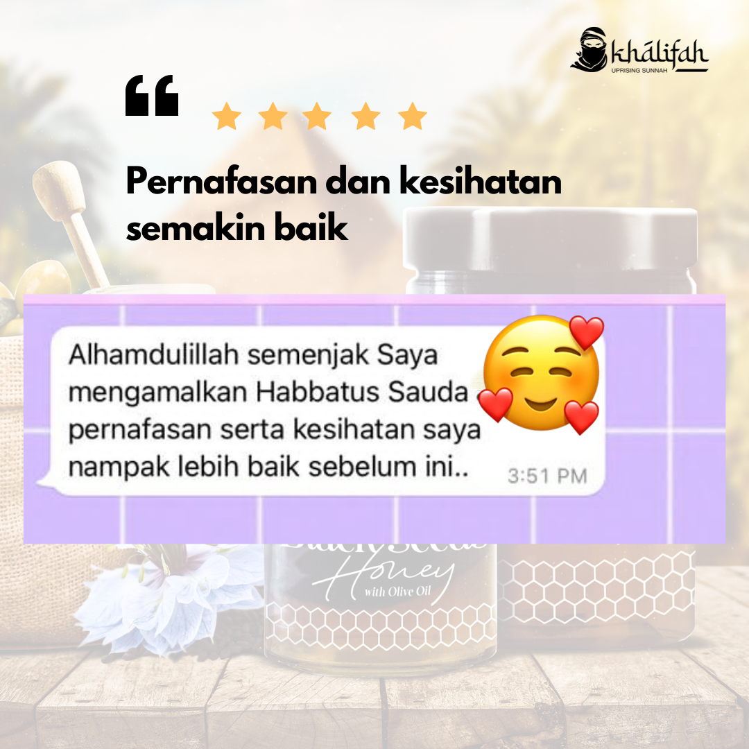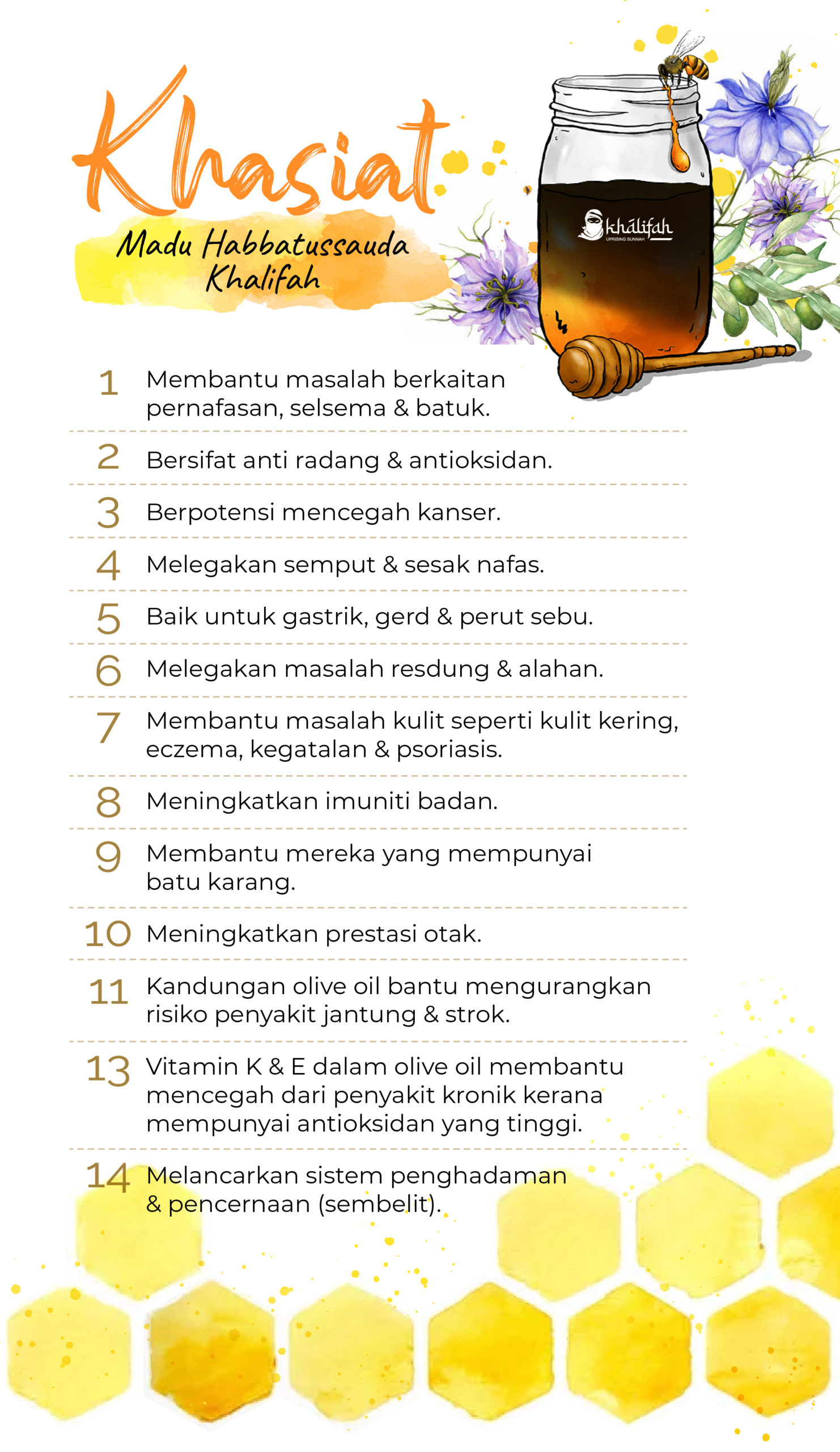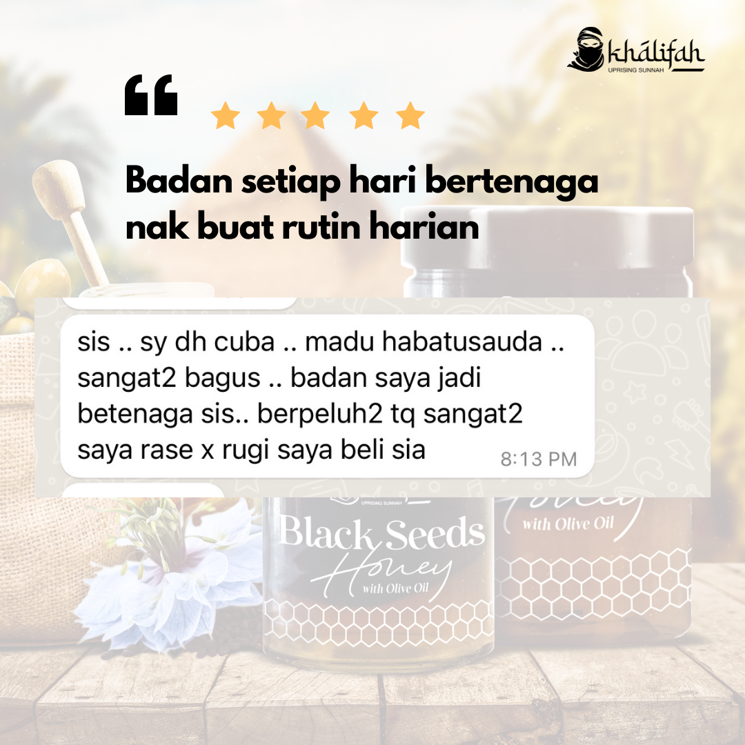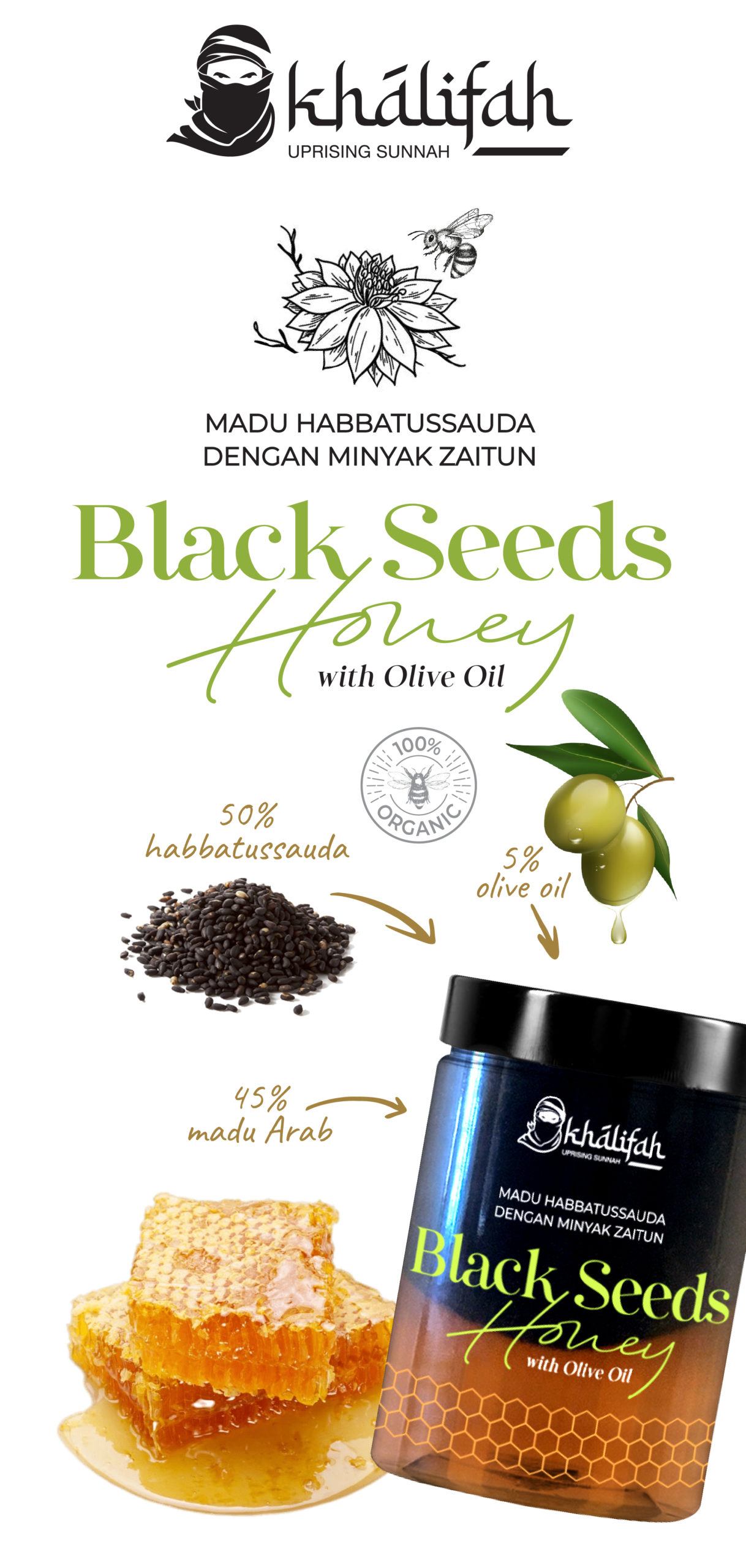 Perbezaan Madu Habbatussauda’ Khalifah dengan madu yang lain ialah ianya dibawakan khas dari kota Tarim, Hadhramawt, premium Gred A dan di dalamnya penuh dengan bijirin habbatussauda’ yang harum dan pekat. Keberkesanannya sepantas 15 minit selepas minum. Tambahan lagi dengan khasiat berganda dari olive oil.
