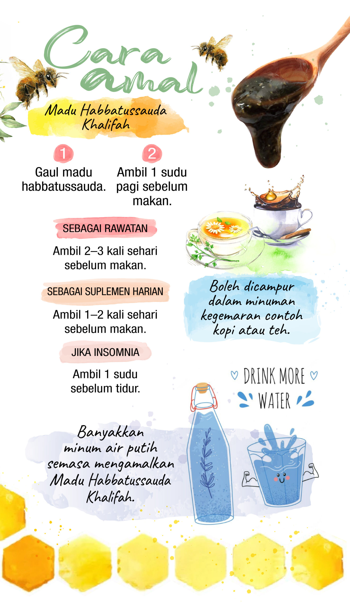 Madu Habbatussauda’ Khalifah sesuai diamalkan seawal usia kanak kanak 2 tahun, orang dewasa, ibu yang menyusu badan, mereka yang bekerja dan sering sibuk serta generasi warga emas yang ingin mendapatkan kecergasan tubuh badan, imuniti badan yang kuat dan mereka yg mengamalkan pemakanan semulajadi dalam kehidupan.