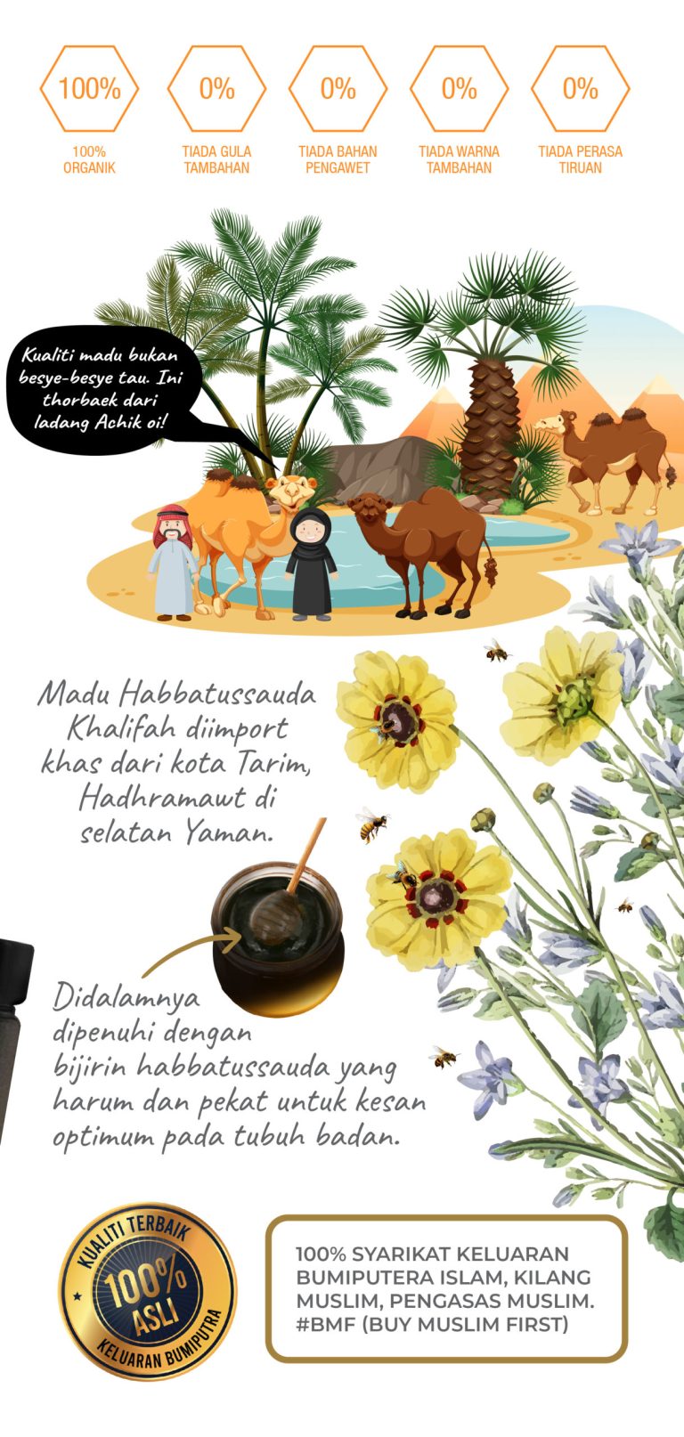 Madu Habbatussauda’ Khalifah diperolehi secara terus daripada kota Tarim, Hadhramawt di selatan Yaman yang juga dikenali sebagai ‘al-Ghanna’ bererti tempat yang sangat subur dan makmur. Madu dari kota Yaman telah diiktiraf antara madu yang terbaik di dunia. Kami telah 2 tahun mengimport dan mengedarkannya di seluruh Malaysia, Singapura dan Brunei.